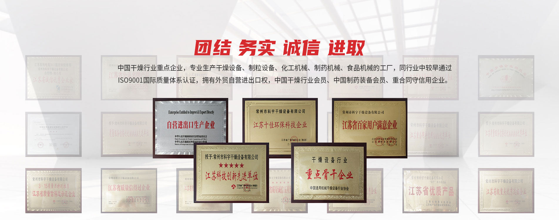 常州市科宇干燥設(shè)備有限公司,是中國(guó)干燥行業(yè)重點(diǎn)企業(yè),專(zhuān)業(yè)生產(chǎn)干燥設(shè)備、制粒設(shè)備、化工機(jī)械、制藥機(jī)械、食品機(jī)械的工廠(chǎng),同行業(yè)中較早通過(guò)ISO9001國(guó)際質(zhì)量體系認(rèn)證,擁有外貿(mào)自營(yíng)進(jìn)出口權(quán),中國(guó)干燥行業(yè)會(huì)員、中國(guó)制藥裝備會(huì)員、重合同守信用企業(yè)。