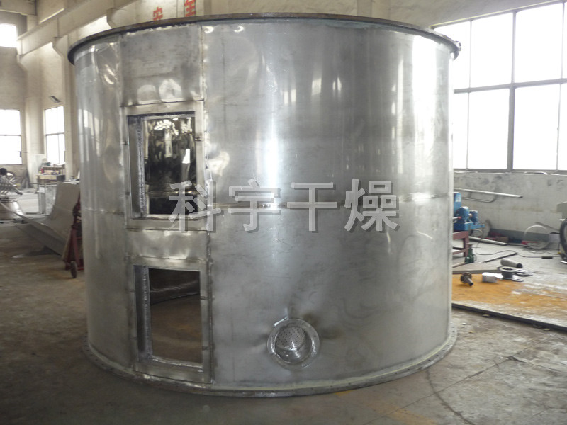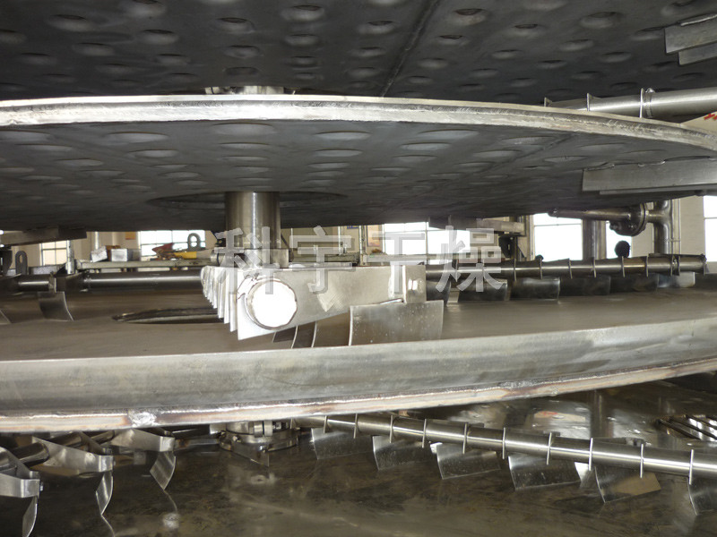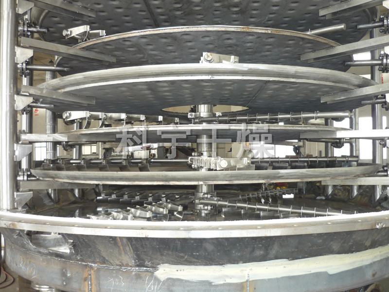 濕物料自加料器連續(xù)地加到干燥器上部第一層干燥盤上,帶有耙葉的耙臂作回轉(zhuǎn)運動使耙臂作回轉(zhuǎn)運動使耙葉連續(xù)地翻抄物料。物料沿指數(shù)螺旋線流過干燥盤表面,在小干燥盤上的物料被移送到外緣,并在外緣落到下方的大干燥盤外緣,在大干盤上物料向里移動并從中間落料口落如下一層小干燥盤中。大小干燥盤上下交替排列,物料得以連續(xù)地流過整個干燥器。中空的干燥盤內(nèi)通入加熱介質(zhì),加熱介質(zhì)形式有飽和蒸汽、熱水和導熱油,加熱介質(zhì)由干燥盤的一端進入,從另一端導出。已干物料從最后一層干燥盤落到殼體的底層,最后被耙葉移送到出料口排出。濕份從物料中逸出,由設(shè)在頂蓋上的排濕口排出,真空型盤式干燥器的濕氣由設(shè)在頂蓋上的真空泵口排出。從底層排出的干物料可直接包裝。通過配加翅片加熱器、溶劑回收冷凝器、袋式除塵器、干料返混機構(gòu)、引風機等輔機,可提高其干燥的生產(chǎn)能力,干燥膏糊狀和熱敏性物 料,可方便地回收溶劑,并能進行熱解和反應操作。