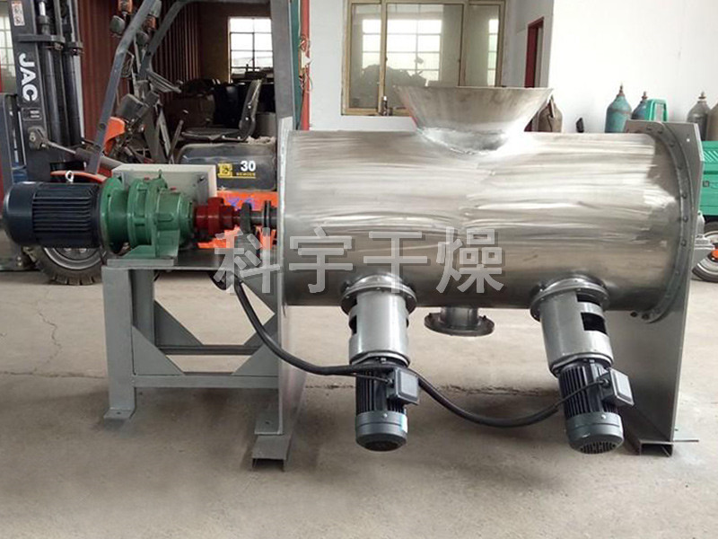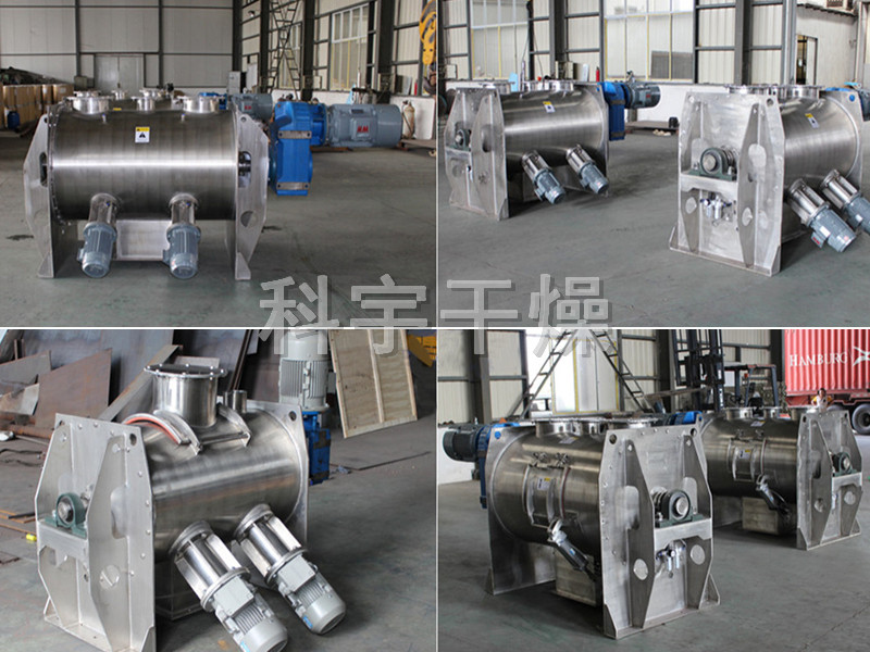 該機型由傳動機構、臥式筒體、犁刀、飛刀四部分組成,物料在犁刀作用下沿筒壁作軸向流支,當物料流經飛刀時被高速度旋轉的飛刀拋灑,從而在較短時間內達到均勻混合。