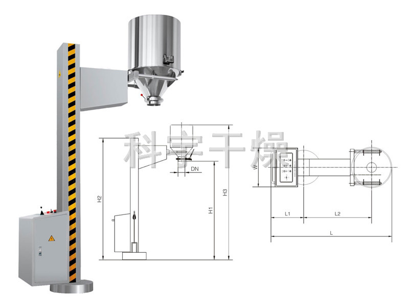 ??TJG 系列固定提升加料機(jī)由兩部分組成,即提升機(jī)及底座。提升機(jī)由機(jī)架、液壓提升系統(tǒng)及料門翻轉(zhuǎn)機(jī)構(gòu)組成。工作時(shí),先將提升機(jī)的料門與料桶扣合,啟動(dòng)提升操作桿,料門與料桶一起上升,啟動(dòng)翻轉(zhuǎn)操作桿,料桶即可番轉(zhuǎn)180度,呈底桶向上姿態(tài)并移動(dòng)到所需位置,利用料門上出料蝶閥,可很容易將物料加入所需的工藝設(shè)備中。