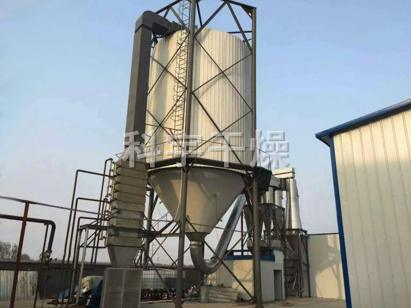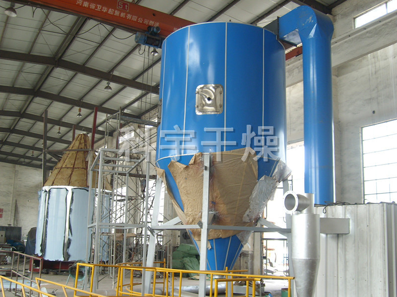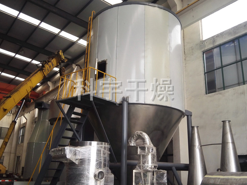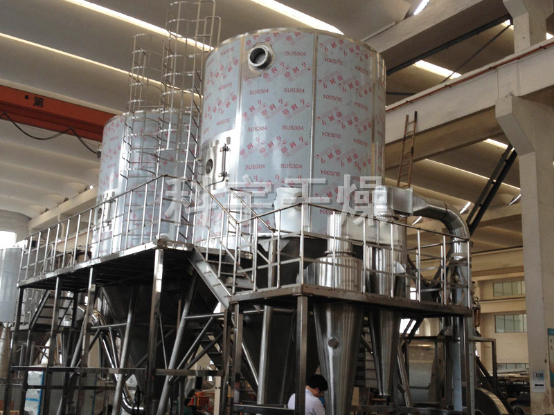 空氣經(jīng)過濾和加熱,進(jìn)入干燥器頂部空氣分配器,熱空氣呈螺旋狀均勻地進(jìn)入干燥室。料液經(jīng)塔體頂部的高速離心霧化器,(旋轉(zhuǎn))噴霧成極細(xì)微的霧狀液珠,與熱空氣并流接觸在極短的時(shí)間內(nèi)可干燥為成品。成品連續(xù)地由干燥塔底部和旋風(fēng)分離器中輸出,廢氣由風(fēng)機(jī)排空。