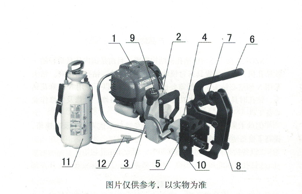 1. 汽油機、2.齒輪箱、3.進水嘴、4標尺定位器、5.定位尺、6.夾緊搖臂、7.調整螺母、8.夾具體、9.進給扳把、10.定位塊、11.注水桶、12.水閥